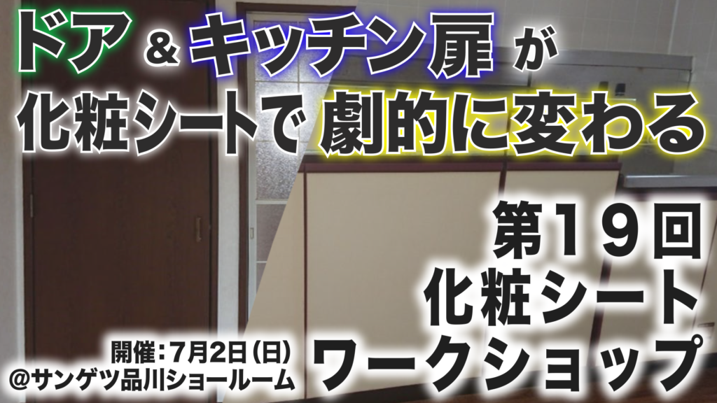 今回のワークショップの実践内容は初の中級編を、とにかく実践が出来る形で開催します!座学を少なく、初の試みのキッチン扉とドアに化粧シートを貼れる機会を増やしたワークショップですので、今回の内容は過去には無いはずです!