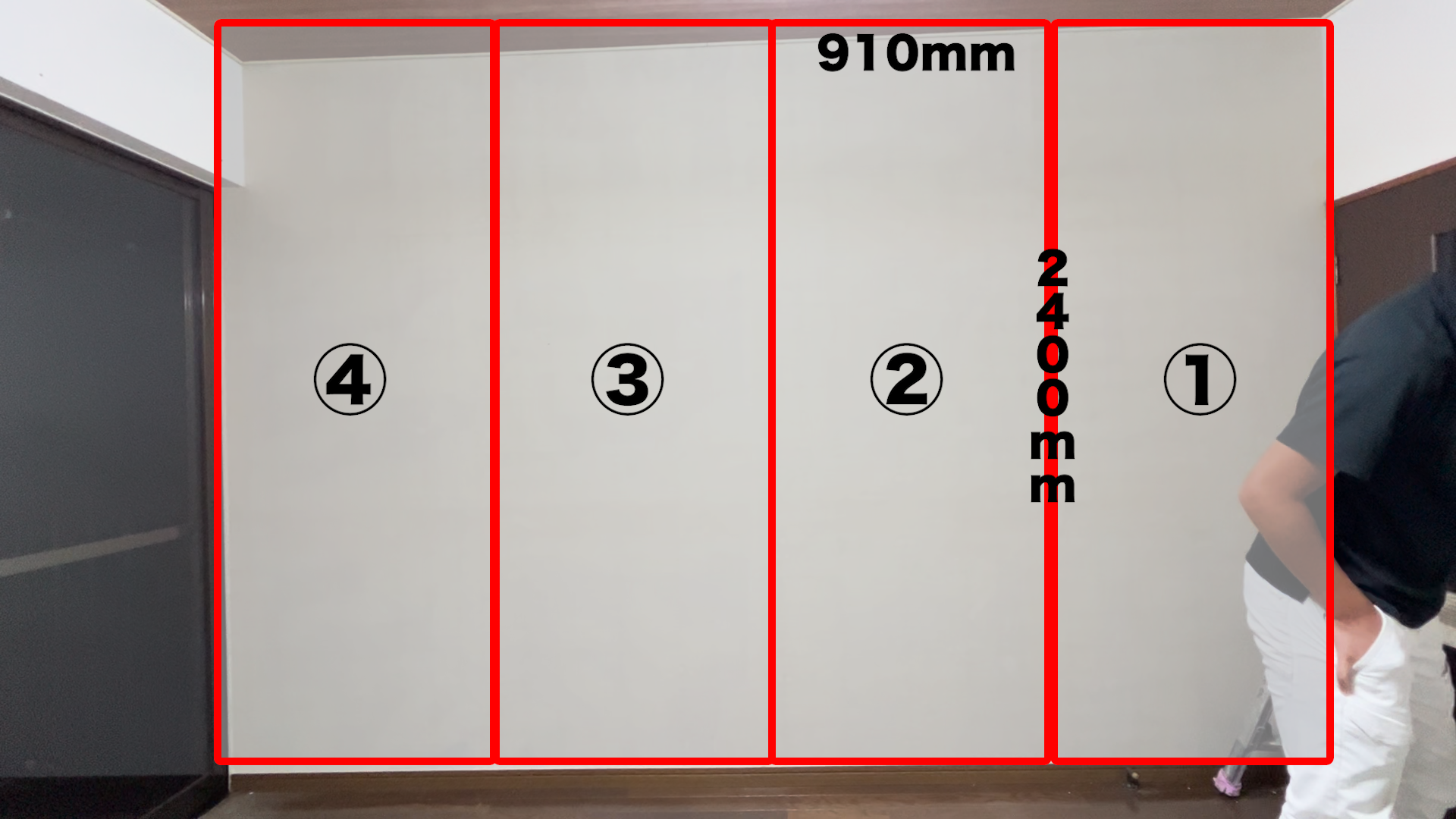 通常壁紙の幅を910mm(有効幅)とした場合、2400mmの壁紙が4枚必要になります。